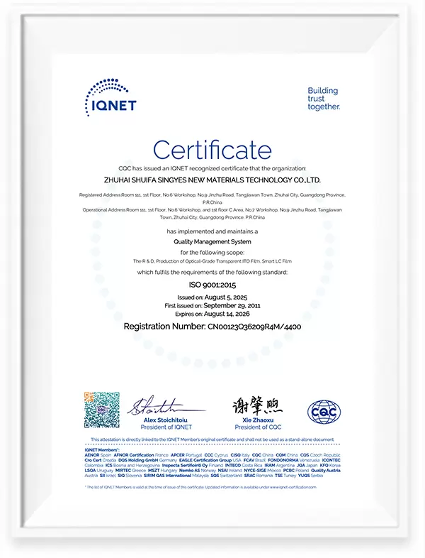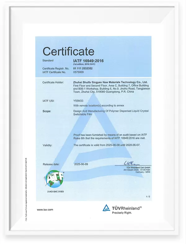 Based on its industrial layout and with a solid foundation for development, Zhuhai Shuifa Singyes New Materials Technology Co., Ltd. is committed to innovation-driven transformation and upgrading, striving to shift from "Made in China" to "Created in China" and from "standardization" to "high quality". In the future, it will uphold the Shuifa concept of "Water is the highest virtue, benefiting the people through development" and leverage the comprehensive competitiveness of being a "state-owned enterprise + listed company". With the attitude of a trailblazer, the company will deeply engage in the field of new materials, focusing on developing new technological products such as automotive smart films and electrochromic films. It aims to resonate with high-end markets such as new energy vehicles, consumer electronics, and intelligent buildings, actively expand niche markets with high-quality products and services, and maximize its global corporate benefits.