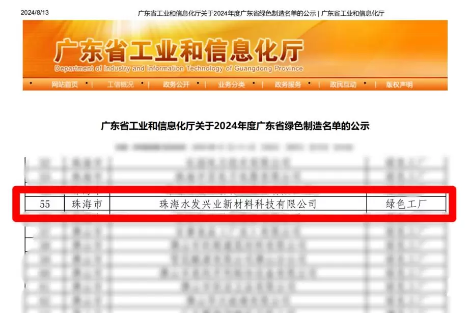 Recently, Zhuhai Shuifa New Materials Technology Co., Ltd. was honored as a ‘Green Factory’ in the 2024 Guangdong Green Manufacturing List released by the Guangdong Provincial Department of Industry and Information Technology. This recognition not only reflects Zhuhai Shuifa Singyes New Materials Technology Co., Ltd. relentless efforts on the path of sustainable development, but also fully affirms its green manufacturing capabilities and commitment to social responsibility.
